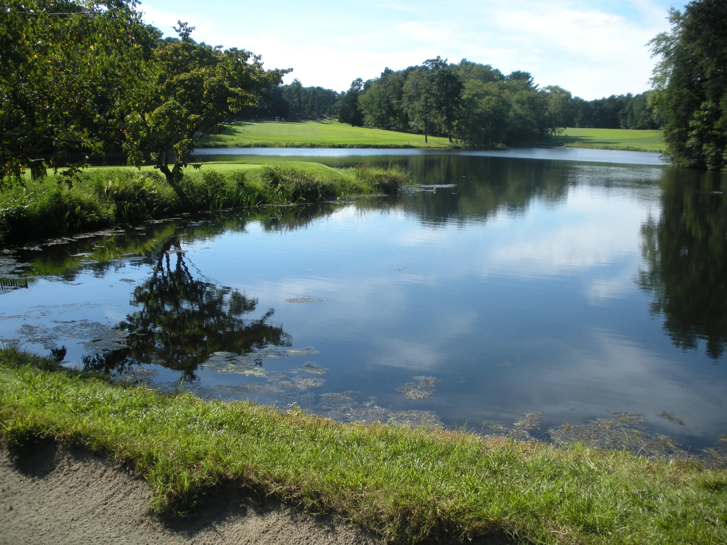 Whether the water features are natural or manufactured, golf course architects throughout history have come up with countless ways to incorporate them into the challenge of their golf holes. Penal, heroic, and strategic schools of golf design all utilize water hazards in differing ways. Below are two famous golf holes that use water features very differently (5th hole, Pine Valley Golf Club as a do-or-die penal hazard; 5th hole, Mid Ocean Club as a bite-off-as-much-as-you-can-chew strategic hazard). When strategic water features can also serve an ecological function, such as fostering biodiversity and/or bio-filtrating stormwater and irrigation run-off, all the better(note the gently sloping naturalized edges in the following pictures).