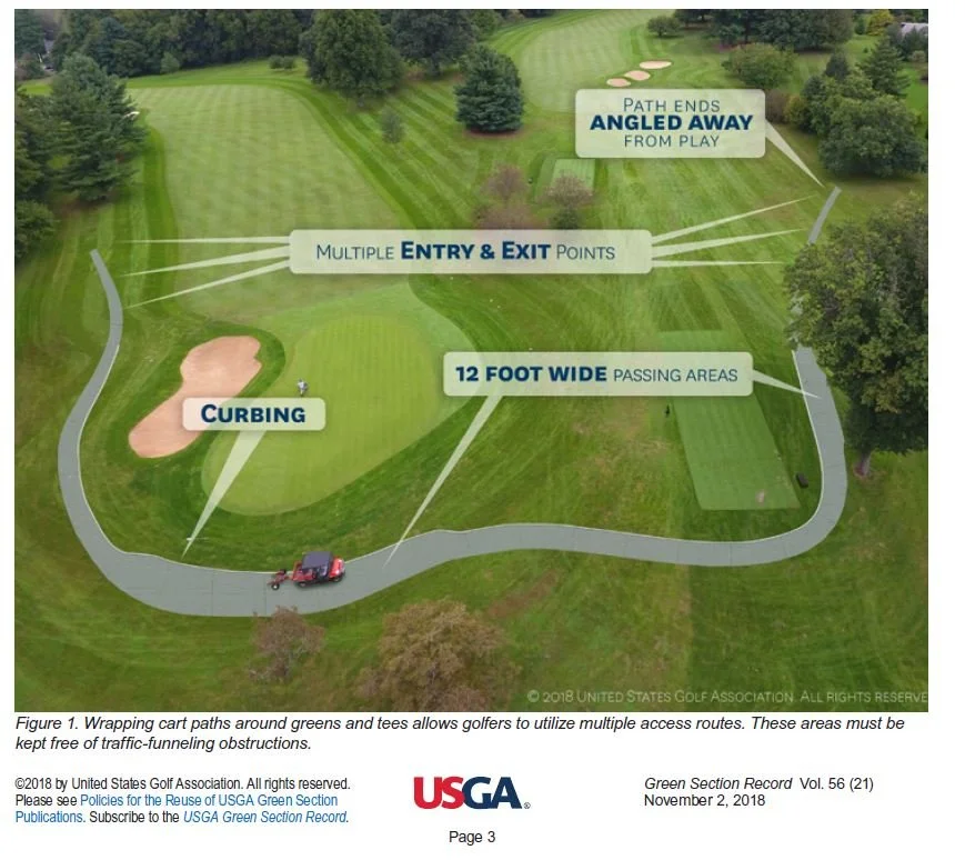 One solution is to minimize the use of cart paths and curbs so that they’re only found in areas that will get the most concentrated traffic, e.g. near buildings, tees, and greens. Below is a graphic showing some design concepts to make these limited paths more effective: